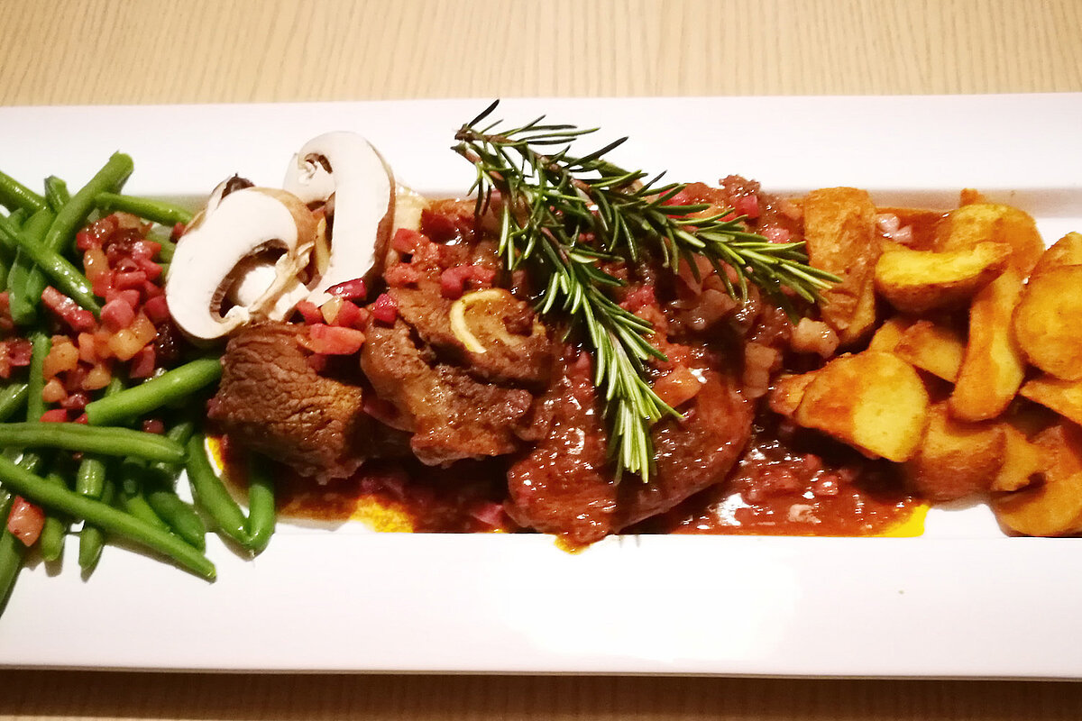 Als Beilage eignen sich Butterspätzle mit Speckfisolen oder Bratkartoffel.